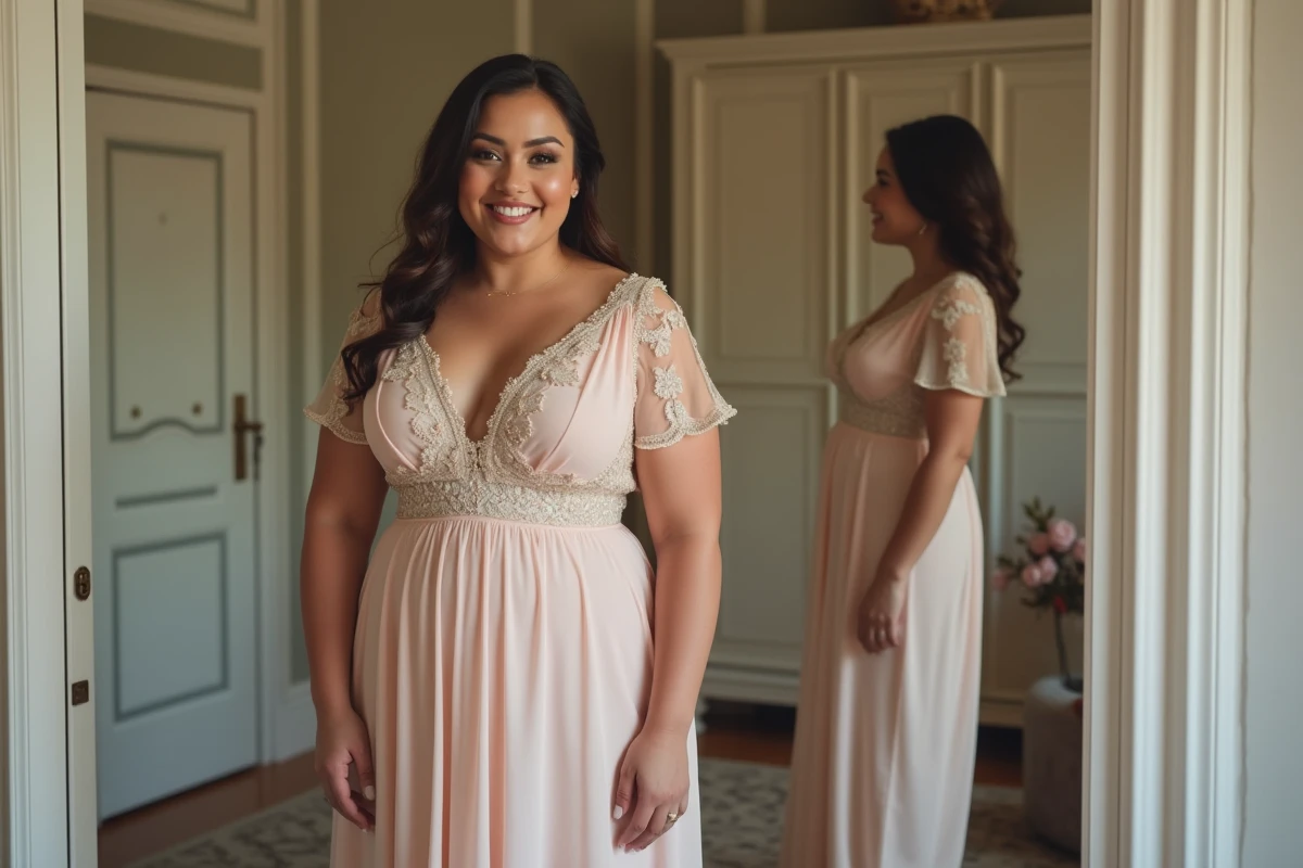 La robe de soirée grande taille ose la couleur et casse les codes. Bleu nuit profond, rouge vibrant, vert émeraude : chaque nuance affirme une personnalité. Côté invitée de mariage, la robe de mariée grande taille se fait sur-mesure ou personnalisée. Entre superpositions, dentelles, jeux de tulle ou voiles graphiques, la créativité s’invite à la fête.